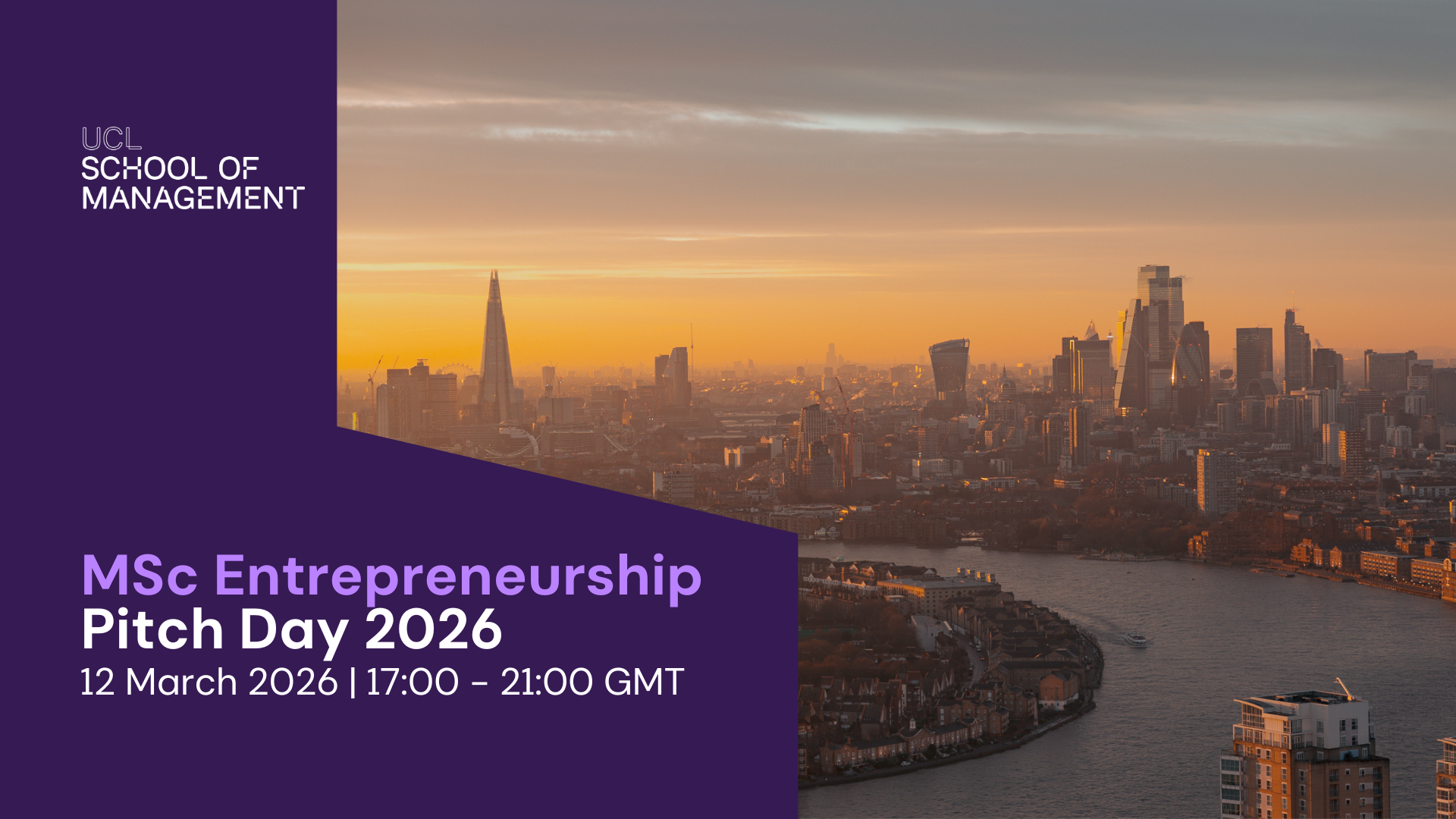 We invite you to join UCL School of Management on Thursday 12 March for the MSc Entrepreneurship Pitch Day 2026. Hosted on Level 50 of One Canada Square, this flagship event represents the final stage of a highly selective MSc Entrepreneurship pitch competition. The evening showcases a curated cohort of innovative, student-founded startups, developed and refined throughout the programme. Attendees will have the opportunity to explore these ventures, engage directly with founders, and gain insight into the entrepreneurial thinking shaping the next generation of high-growth businesses.