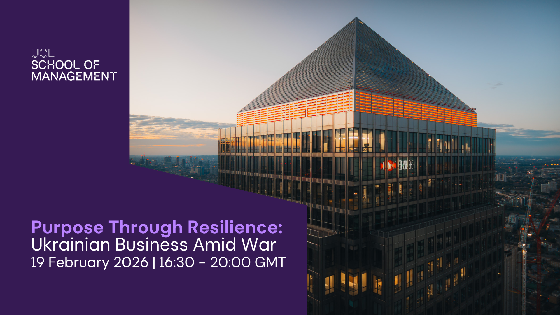 On Thursday 19 February, UCL School of Management’s team behind the Next Generation of Entrepreneurs for Ukraine Lecture Series will host ‘Purpose Through Resilience: Ukrainian Business Amid War,’ an evening that marks the fourth anniversary of the war against Ukraine and reminds the international community of its ongoing humanitarian, social and political impact.