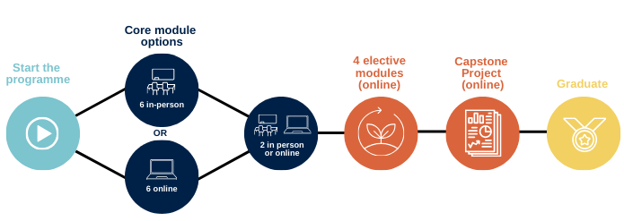 - Or study everything online, with 15 hours of live teaching per module, supplemented with 15 hours of flexible, self-guided learning.
