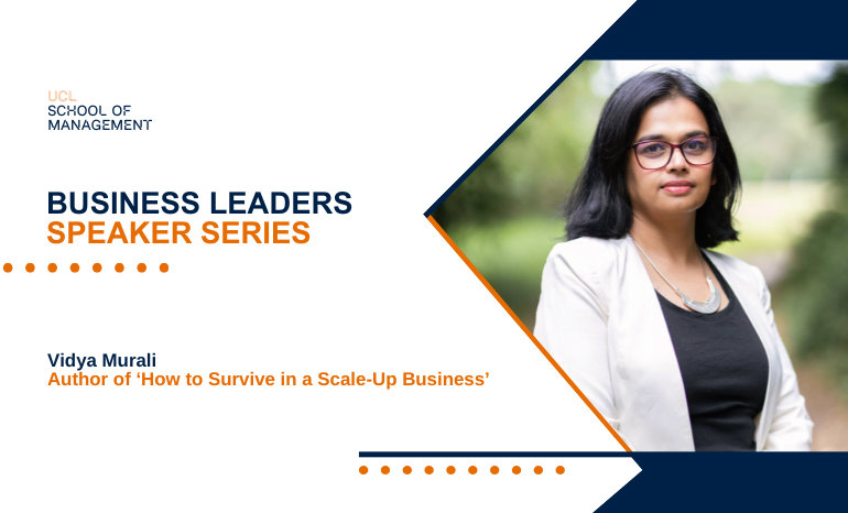Vidya Murali, author of ‘How to Survive in a Scale-Up Business’ (Routledge, Aug 2025), will join UCL School of Management on Thursday 12 February, for the Business Leaders Speaker Series. Open to the entire UCL and Wharf Connect communities, Vidya will be sharing parts of her book that will inspire and help students, graduates and early career professionals step into roles at startups and scale-ups.