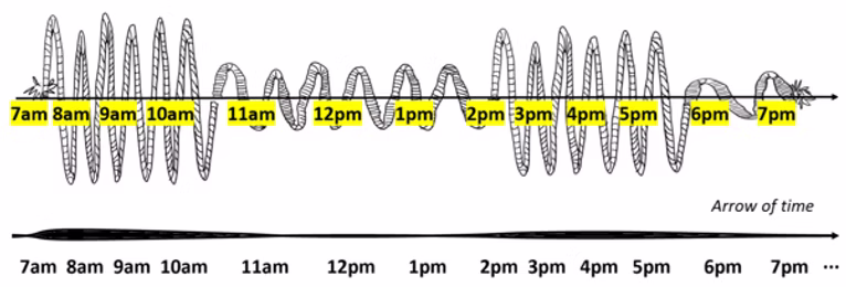Yes, particularly when I started trying to visualise the ideas. One moment that really shifted things for me was developing the illustrations, especially the idea of experienced time as something with ‘thickness’ of the time line. When time feels slow, it’s as if that line becomes thicker and richer; when time flies, it becomes thin.